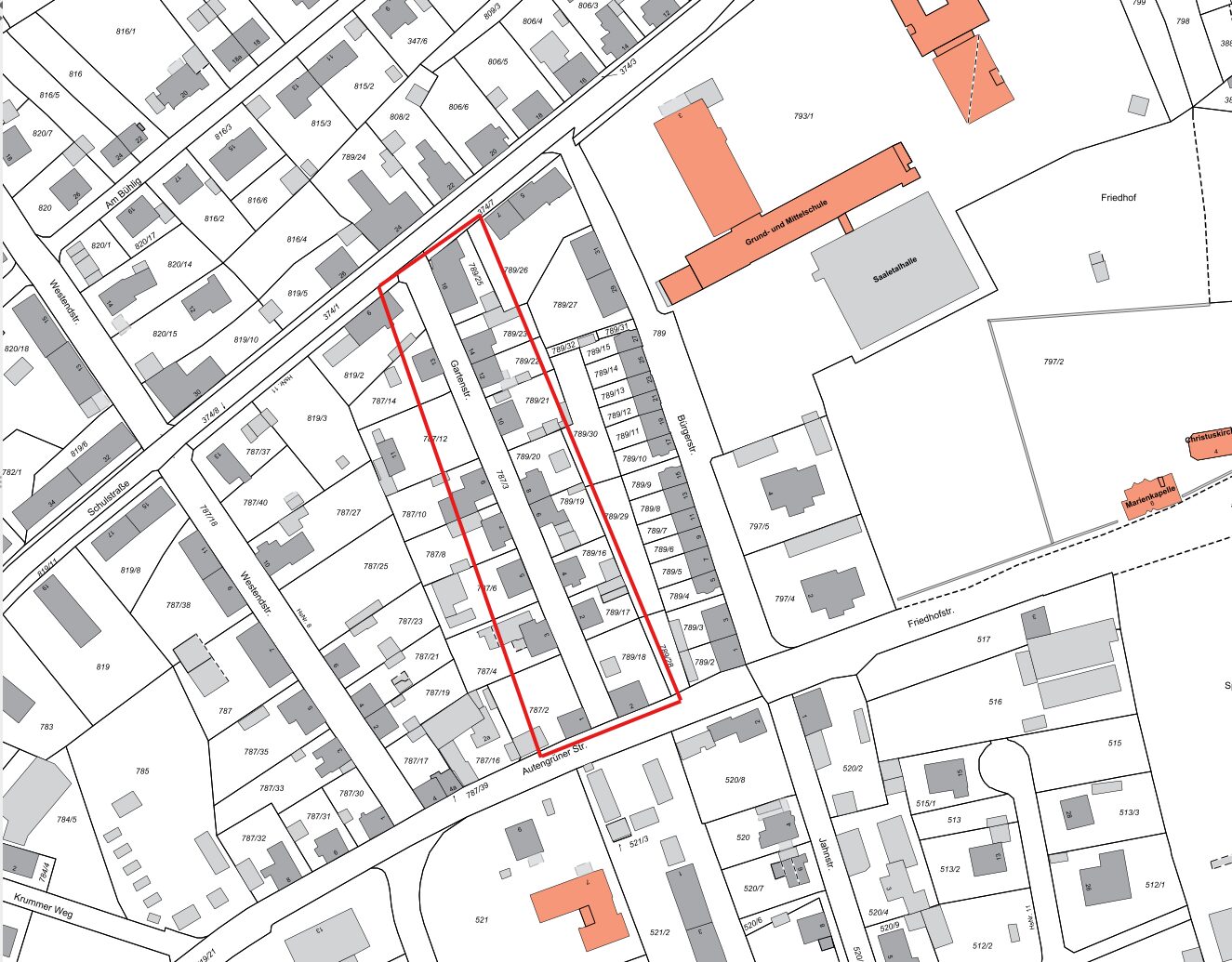 HEUTE, 26.02.2026 von 12.00 bis 2.00 Uhr muss in dem im Plan gekennzeichneten Bereich das Wasser abgesperrt werden. Der Grund hierfür ist ein Rohrbruch in der Gartenstraße.