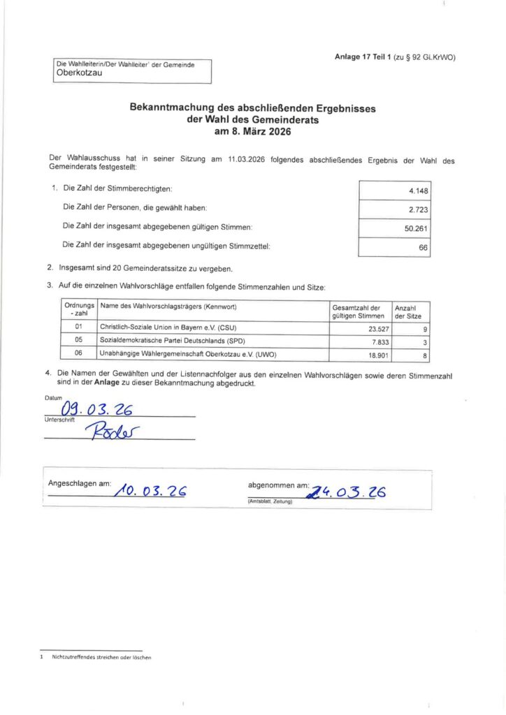 Die Kommunalwahl 2026 ist vorüber und die Bürgerinnen und Bürger haben für die Legislaturperiode 2026 – 2032 ihren Bürgermeister und ihren neuen Marktgemeinderat gewählt. Für das entgegengebrachte Vertrauen anlässlich meiner Wiederwahl zum Ersten Bürgermeister darf ich mich sehr herzlich bedanken. Ich nehme diesen großen Auftrag im Bewusstsein dieser großen Verantwortung gerne an, mit Gottes Hilfe, großer Freude und ganzer Kraft. Zum 30. April scheiden acht aktive Marktgemeinderäte aus; sieben waren zwischen 3 und 32 Jahren zum Wohle unserer Heimatgemeinde ehrenamtlich tätig. Marktgemeinderat und 2. Bürgermeister Erich Pöhlmann darf sogar auf insgesamt 42 Jahre zurückblicken, in denen er die Geschicke unserer Heimatgemeinde mitgestalten durfte. Für dieses Engagement und diese besondere Leistung wurde er zuletzt auch von Innenminister Joachim Herrmann gewürdigt und mit der Medaille für besondere Verdienste um die kommunale Selbstverwaltung in Silber ausgezeichnet.