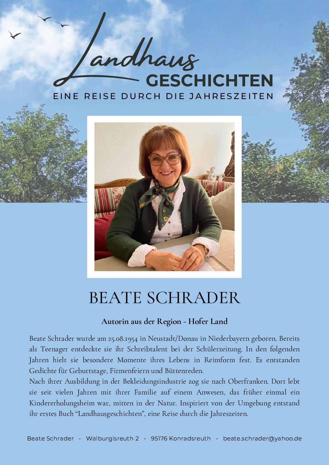 Wir freuen uns immer über regionale Autoren, die bei uns zu Gast sind, ihre Bücher vorstellen und bei uns lesen. Die Autorin Beate Schrader stellt zum Begegnungscafé am Mittwoch, den 15. April um 14:30 Uhr ihr Buch „Landhausgeschichten – Eine Reise durch die Jahreszeiten“ bei uns vor und wir laden herzlich dazu ein! Einlass im Jugendtreff ist ab 14:00 Uhr.