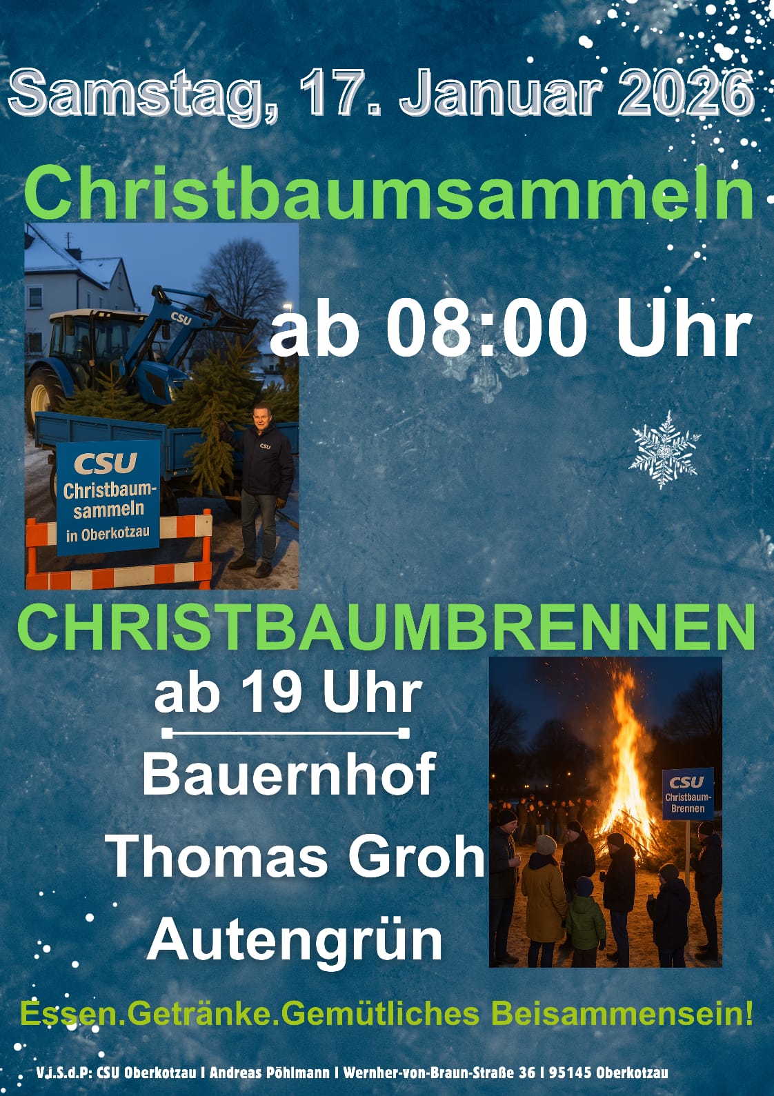 Das Team der CSU und JU Oberkotzau mit Listenkandidaten sammelt Ihre ausgedienten Christbäume ein und sorgt anschließend dafür, dass sie dem Naturkreislauf zurückgegeben werden. Kurzum, sie werden noch am gleichen Tag thermisch entsorgt. Dazu laden wir alle Oberkotzauer Bürgerinnen und Bürger zum traditionellen Christbaumbrennen ein. Ein knisterndes Feuer, warme Getränke, nette Gespräche – einfach ein Moment, an dem man sich trifft, stehen bleibt und gemeinsam ins neue Jahr startet.