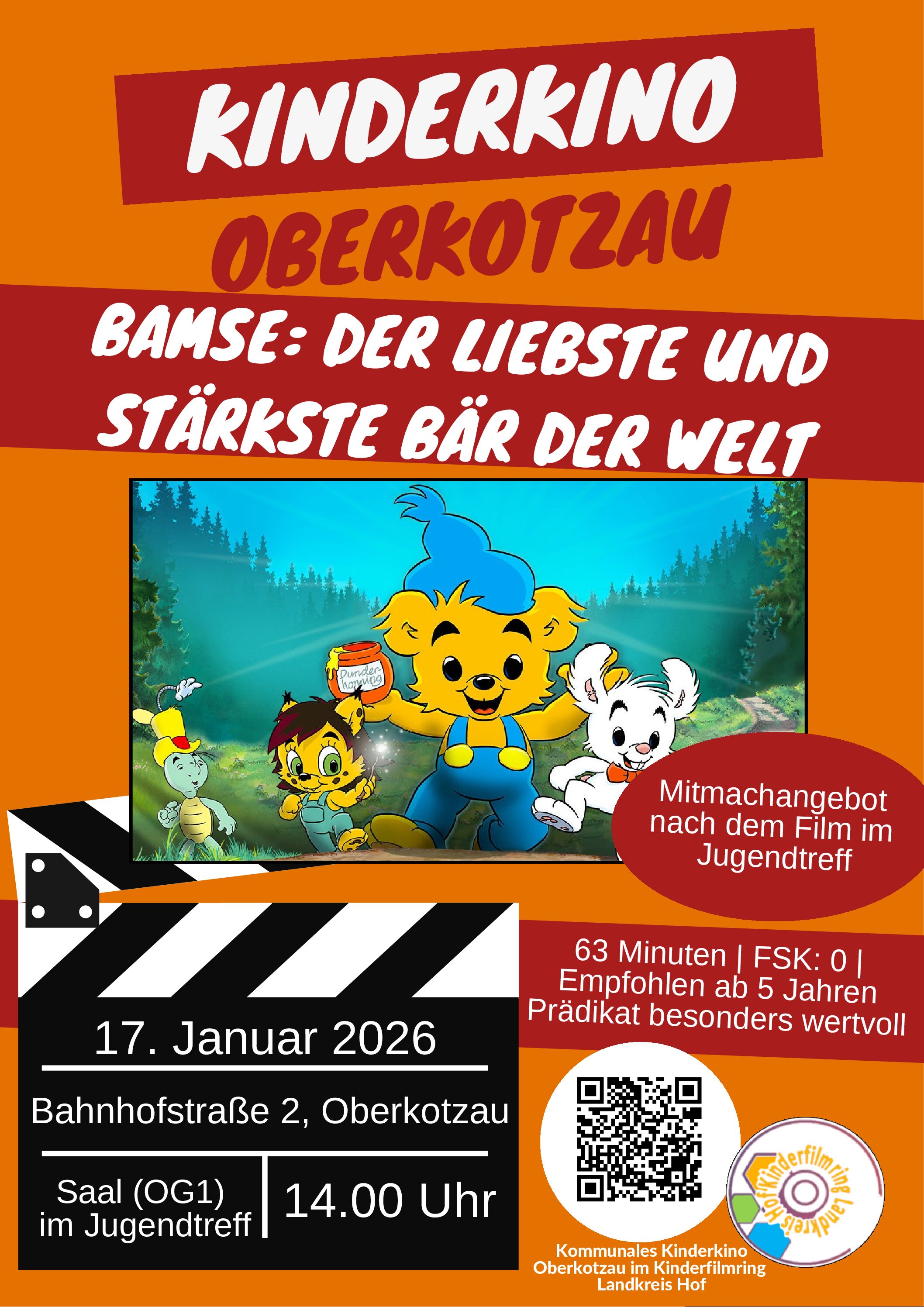 Kinderkino „Bamse: Der liebste und stärkste Bär der Welt“ Datum 17. Januar 2026 Uhrzeit 14:00 Jugendtreff Bahnhofstraße 2