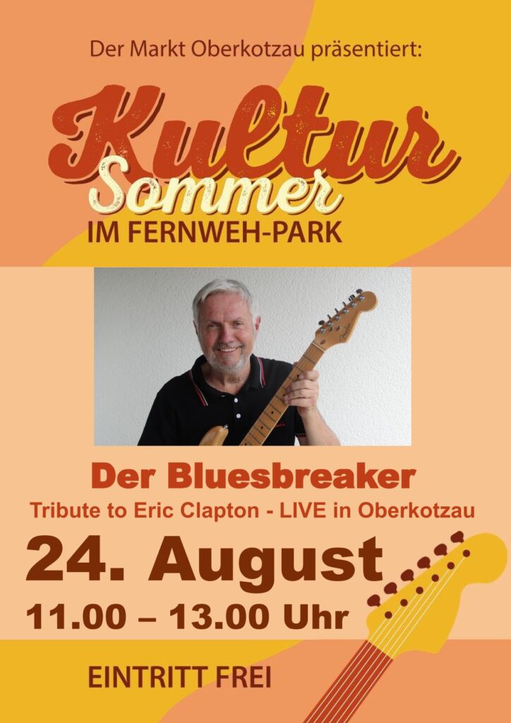 Zum Abschluss der Reihe dürfen sich Musikfreunde am kommenden Sonntag, 24. August 2025, von 11 bis 13 Uhr noch auf ein ganz besonderes Konzert freuen: „Der Bluesbreaker“ Erich Meinlschmidt präsentiert sein neues Programm „Tribute to Eric Clapton“.