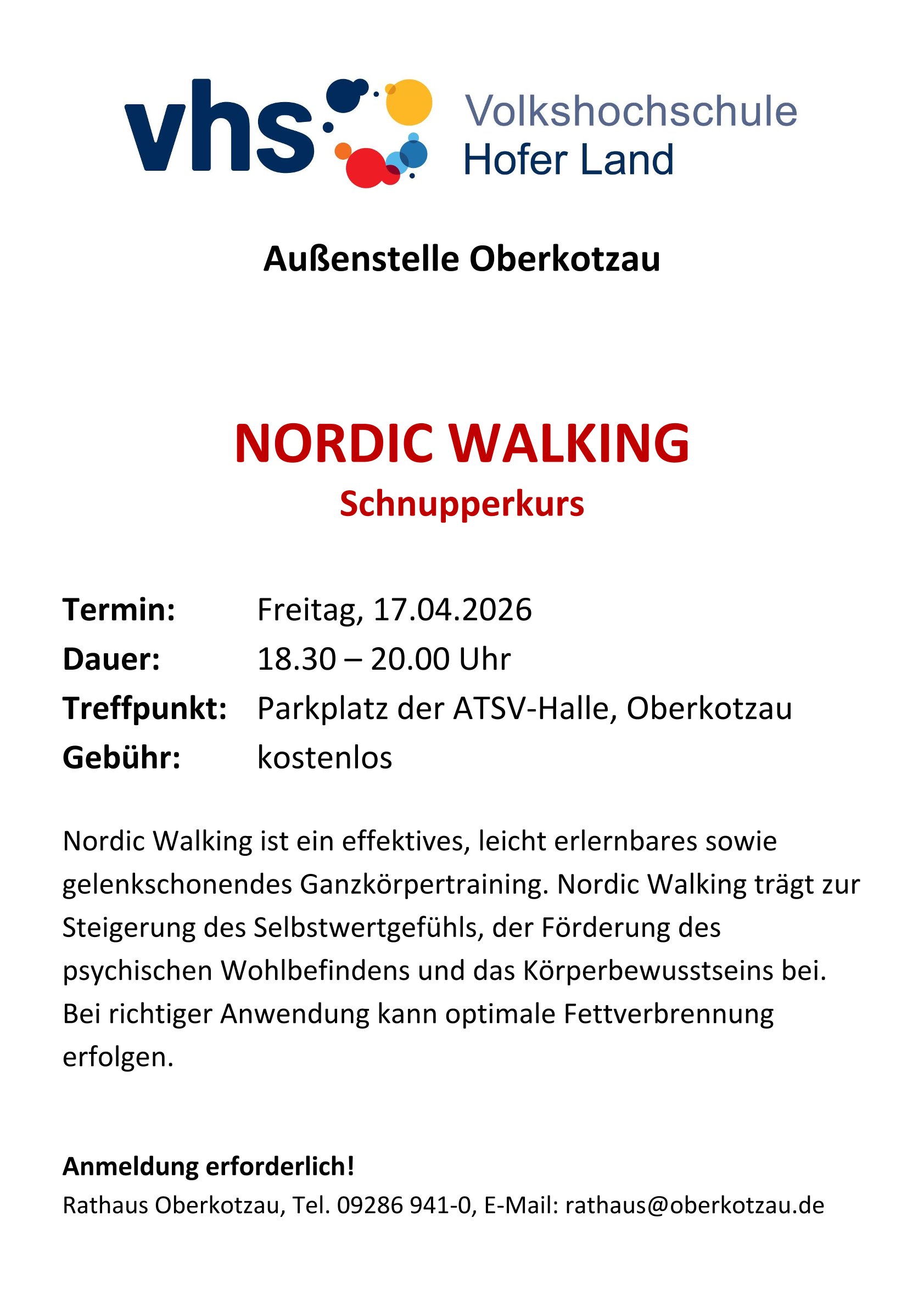 Nordic Walking – Schnupperkurs Datum 17. April 2026 Uhrzeit 18:30 - 20:00 ATSV-Sporthalle Jean-Paul-Str. 24