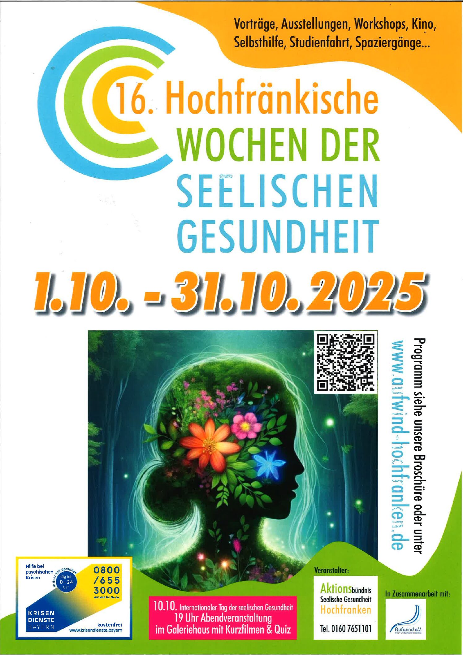 Auch heuer ist der Jugendtreff an den „Hochfränkischen Wochen der seelischen Gesundheit“ mit Veranstaltungen beteiligt. Neben dem Vortrag „Der unsichtbare Rucksack – was tragen Sie mit sich herum?“ gibt es noch das Begegnungscafé zum Thema „Faszination Faszien“ und als aktives Abendangebot den „Tanz der vier Himmelsrichtungen“. Die Veranstaltungen sind kostenfrei.
